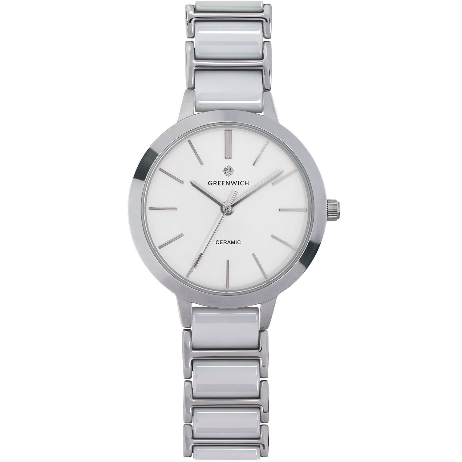 Женские кварцевые часы. Центральные часовая, минутная и секундная стрелки. Белый циферблат. Круглый корпус выполнен из нержавеющей стали. Диаметр корпуса составляет 32 мм. Стальной браслет с керамическими вставками, раскладывающаяся застежка. Прочное минеральное стекло устойчивое к мелким механическим повреждениям. Водостойкость WR 50 (мытье рук, дождь).