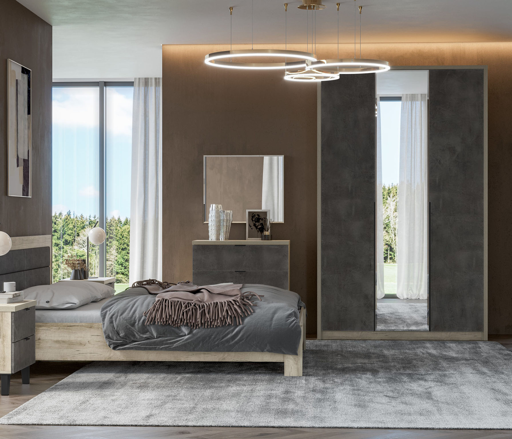 Шкаф ШК-3202 Анима – трёхстворчатая модель шкафа из набора модульной спальни Анима. В этом варианте есть высокое зеркало на средней дверце, что очень удобно в спальне. Модный дизайн в стиле Лофт в природных цветах дерева и камня.Внутри штанга для одежды шириной в две секции, над ней широкая полка. Третья секция занята полками. Возможно установить дополнительную полку под штангой.Индустриальная эстетика стиля лофт в сочетании с концептуальным декором и обилием роскоши фактур на фасадах - яркий контраст белого и серого камня, который выглядит тёплым. Природный цвет материала ЛДСП с прожилками и матовая металлическая текстура длинных ручек создает мягкий и запоминающийся акцент на чистых формах. Создавая атмосферу тепла, уюта, легкости, впечатления дорогого интерьера привлекая к себе внимание и визуально обогощая стилистику любого пространства.Ширина, мм: 1438 Высота, мм: 2330 Глубина, мм: 592