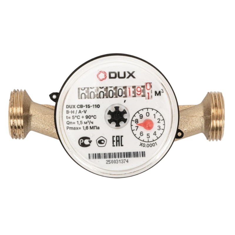 Счетчик воды универсальный DUX-15-110+КМЧ-15-ОК, латунь, класс А/В