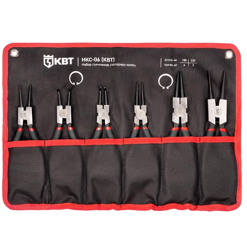Набор съемников стопорных колец КВТ 92036 из серии МАСТЕР содержит 6 инструментов для установки и демонтажа внешних и внутренних стопорных колец диаметром от 19 до 82 мм. Длина съемников — 180/230 мм, изготовлены из стали С55Преимущества Полный комплект покрывает все типы стопорных колец, упрощая ремонтные работы в автосервисе и механике Двухкомпонентные рукоятки предотвращают выскальзывание и повышают комфорт Закаленная сталь с антикоррозийным покрытием гарантирует долговечность при интенсивном использовании Компактная длина облегчает доступ к труднодоступным местам