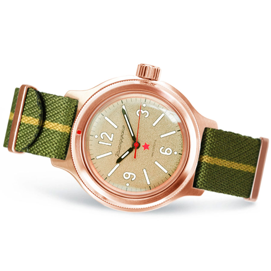 Механические часы. Противоударное устройство узла баланса. Калибр Восток 2409.01 на 17 камнях. Запас хода 38 часов. Часы, минуты, секунды. Циферблат с часовыми индексами в виде штрихов и цифр. Стрелки и метки заполнены флуоресцентной краской переменного действия. Корпус выполнен из бронзы. Размеры корпуса 40 мм х 46 мм, толщина 13 мм. Устойчивое к возникновению мелких механических повреждений органическое стекло. Текстильный ремешок. Водостойкость WR 200 (плавание с погружением).
