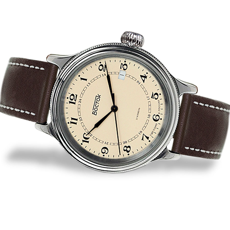 Механические часы с автоподзаводом. Калибр Восток 2416. Запас хода на 31 час. Автоподзавод с предохранительным устройством от перезавода пружины. Часы, минуты, секунды. Индикация даты. Циферблат с часовыми индексами в виде цифр. Корпус выполнен из нержавеющей стали. Размеры корпуса 42 мм х 50 мм, толщина 11 мм. Устойчивое к возникновению мелких механических повреждений минеральное стекло. Кожаный ремешок.