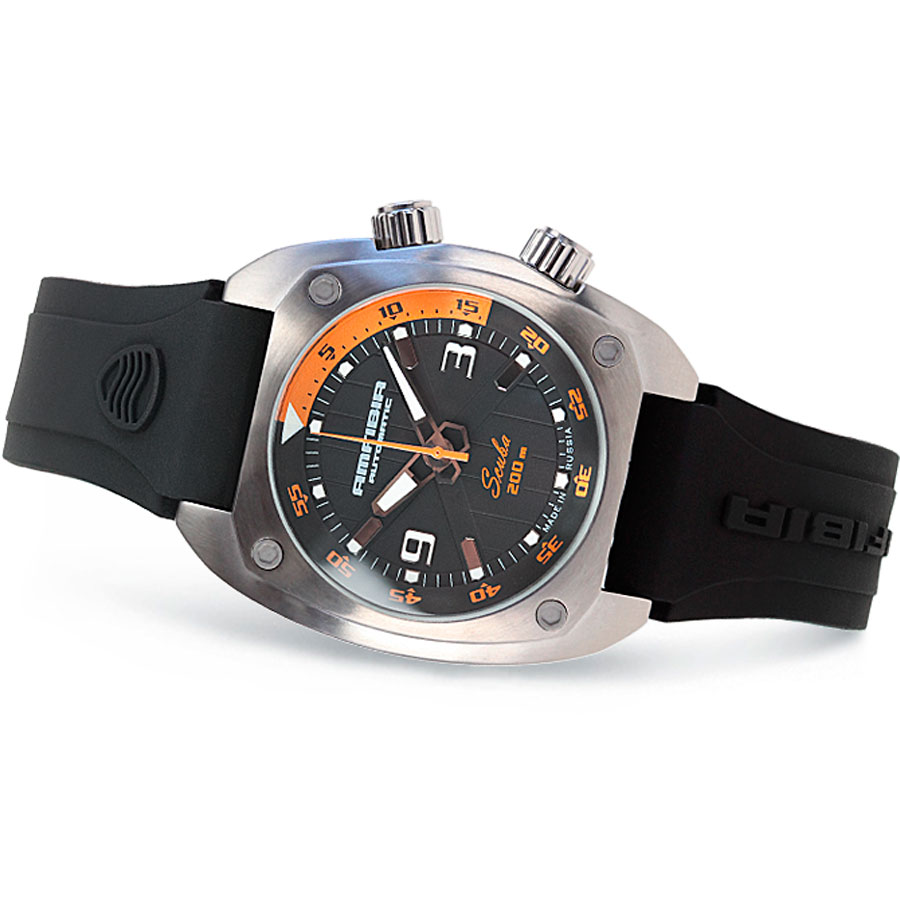 Механические часы с автоподзаводом. Противоударное устройство узла баланса. Автоподзавод с предохранительным устройством от перезавода пружины. Калибр Восток 2415.01. Запас хода 31 час. Часы, минуты, секунды. Корпус выполнен из нержавеющей стали. Размеры корпуса 41 мм х 47 мм, толщина 15 мм. Устойчивое к возникновению мелких механических повреждений минеральное стекло. Силиконовый ремешок. Водостойкость WR 200 (плавание с погружением).