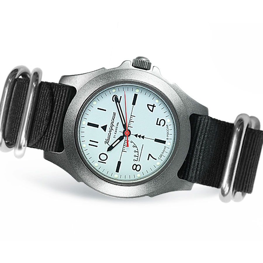 Механические часы с автоподзаводом. Калибр Восток 2415.01. Запас хода на 33 часа. Автоподзавод с предохранительным устройством от перезавода пружины. Часы, минуты, секунды. Стрелки и метки заполнены флуоресцентной краской переменного действия. Циферблат с часовыми индексами в виде штрихов и цифр. Корпус выполнен из латуни. Размеры корпуса 41 мм х 47 мм, толщина 13 мм. Устойчивое к возникновению мелких механических повреждений минеральное стекло. Текстильный ремешок. Водостойкость WR 20 (брызги).
