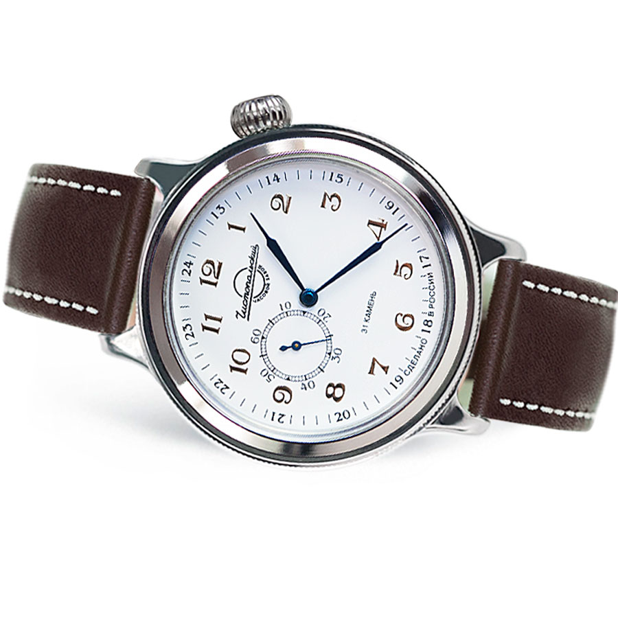 Механические часы с автоподзаводом. Калибр Восток 2415.02. Запас хода на 33 часа. Противоударное устройство узла баланса. Автоподзавод с предохранительным устройством от перезавода пружины. Часы, минуты, секунды. Циферблат с часовыми индексами в виде цифр. Корпус выполнен из нержавеющей стали. Размеры корпуса 44 мм х 52 мм, толщина 12 мм. Устойчивое к возникновению мелких механических повреждений минеральное стекло. Кожаный ремешок.