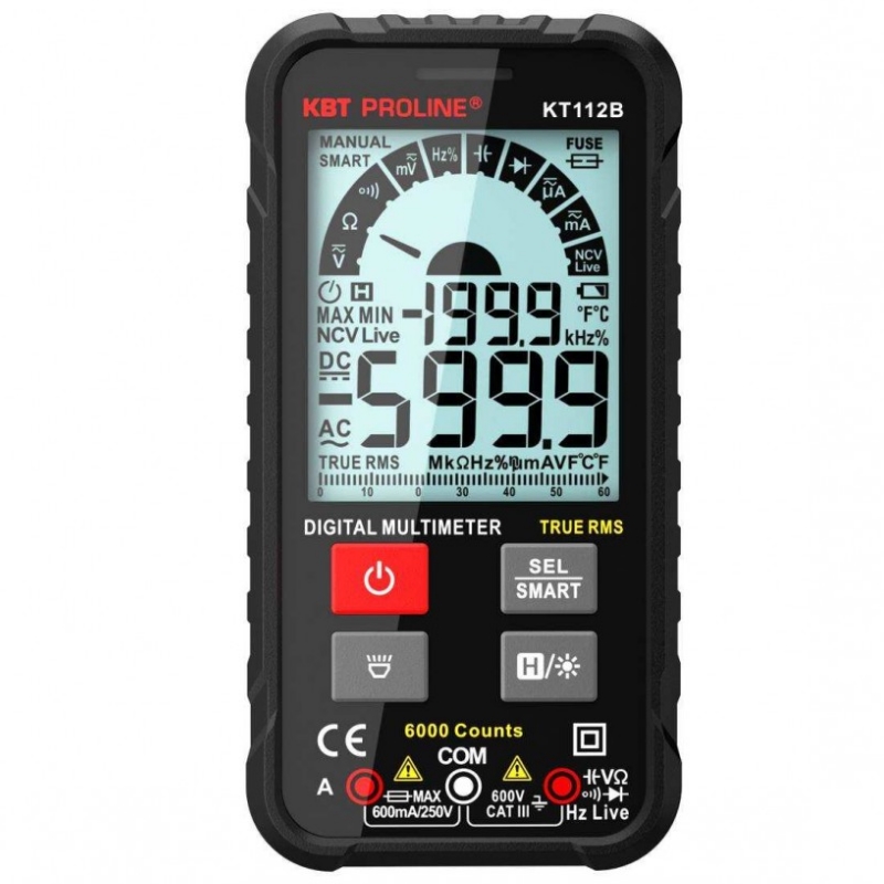 Мультиметр цифровой КВТ 86326 из серии PROLINE — компактный SMART-инструмент с True RMS и автоматическим выбором режимов для измерения напряжения, тока, сопротивления, емкости и частоты в электроустановках. Оснащен большим цветным ЖК-дисплеем 6000 отсчетов, бесконтактным детектором напряжения (NCV), подсветкой и фонариком для работы в темнотеПреимущества True RMS и AUTO RANGE обеспечивают точные измерения без ручной настройки Бесконтактный NCV с звуковой/цветовой индикацией ускоряет поиск фазы/нейтрали Функции MAX/MIN, DATA HOLD и подсветка повышают удобство в профессиональных задачах Защитный кожух и компактность упрощают транспортировку на объектах