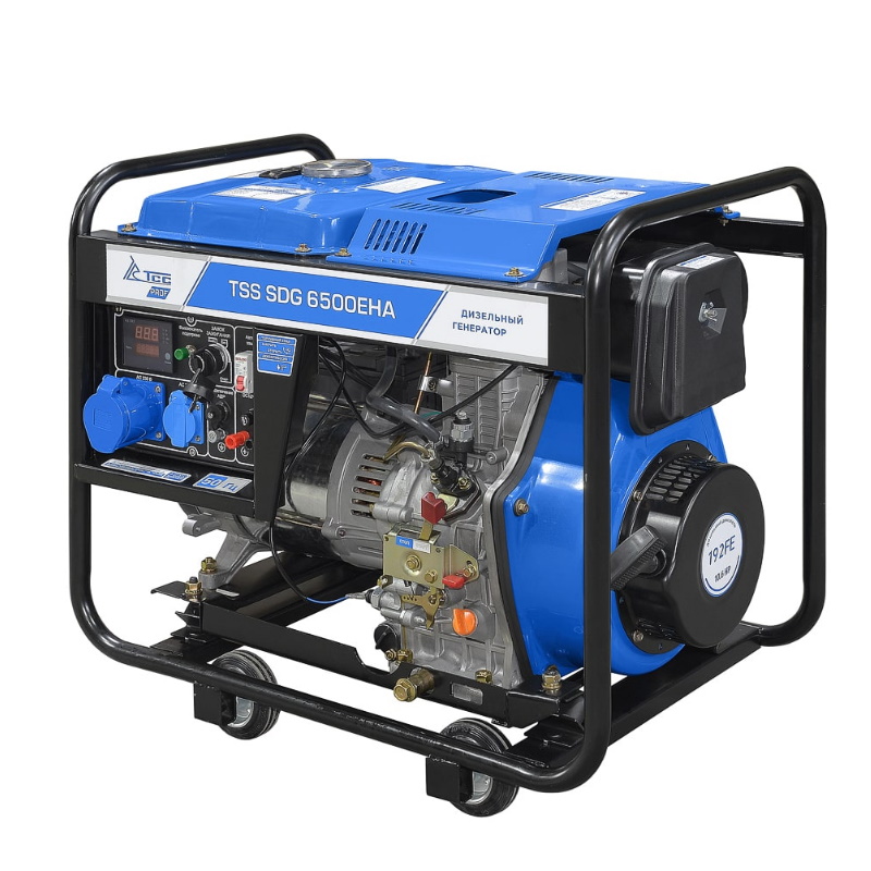 Дизельный генератор с электростартом и с разъемом для подключения блока автоматики.TSS SDG 6500EHАпредназначен для выработки электроэнергии с основными характеристиками: напряжение - 220 вольт, частота 50 Гц и номинальной мощностью 6 кВт, оснащенный колесным комплектом для удобства передвижения.Преимущества Двигатель одноцилиндровый четырехтактный, с воздушным типом охлаждения Электронное зажигание не требует дополнительных настроек, что упрощает обслуживание двигателя в течение всего срока службы Интеллектуальный модуль с многофункциональным дисплеем предлагает эффективный способ контроля параметров работы (на дисплее отображаются часы работы(моточасы) дизельного генератора, напряжение, частота тока) Электронные регуляторы напряжения обеспечивают высокий уровень стабильности выходного напряжения и устойчивость к перегрузкам Автоматический выключатель для защиты от перегрузок и короткого замыкания Встроенный датчик уровня топлива позволяет осуществлять визуальный контроль остатка топлива в баке. При понижении давления масла ниже допустимого уровня на панели управления загорается сигнальная лампа Топливный бак увеличенного объема обеспечивает автономную работу агрегата в течение 6 часов, с учетом обеспечения режима охлаждения В дизельных генераторах ГК ТСС установлен предпусковой подогрев, который делает возможным сам запуск системы в сложных условиях, при температуре от 0 до -15 ℃ Розетки: 220В – 16А 1 шт., 220В - 32А 1 шт.(промышленная), что позволяет подключать разные электроинструменты