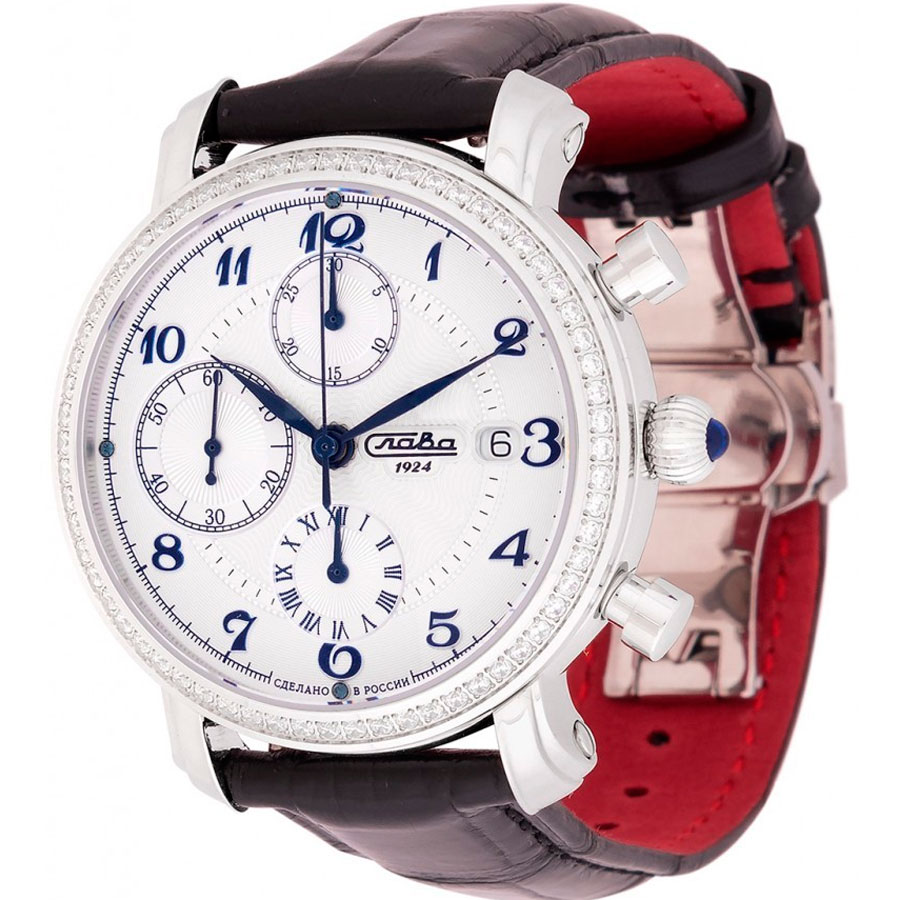 Механический хронограф с автоподзаводом. Водостойкость WR 50 (мытье рук, дождь). Часы, минуты, секунды. Индикация даты. Циферблат с часовыми индексами в виде цифр. Корпус выполнен из нержавеющей стали с родиевым покрытием. Диаметр корпуса 41 мм. Устойчивое к возникновению мелких механических повреждений сапфировое стекло. Кожаный ремешок. Часы украшены цирконами.
