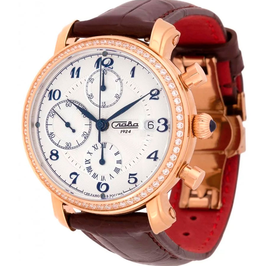Механический хронограф с автоподзаводом. Водостойкость WR 50 (мытье рук, дождь). Часы, минуты, секунды. Индикация даты. Циферблат с часовыми индексами в виде цифр. Корпус выполнен из нержавеющей стали с PVD покрытием. Диаметр корпуса 41 мм. Устойчивое к возникновению мелких механических повреждений сапфировое стекло. Кожаный ремешок. Часы украшены цирконами.