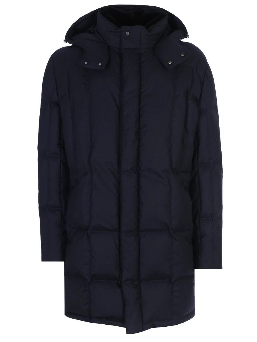 -Синий удлиненный стеганый пуховик из кашемира с мембраной от BOS BISON.