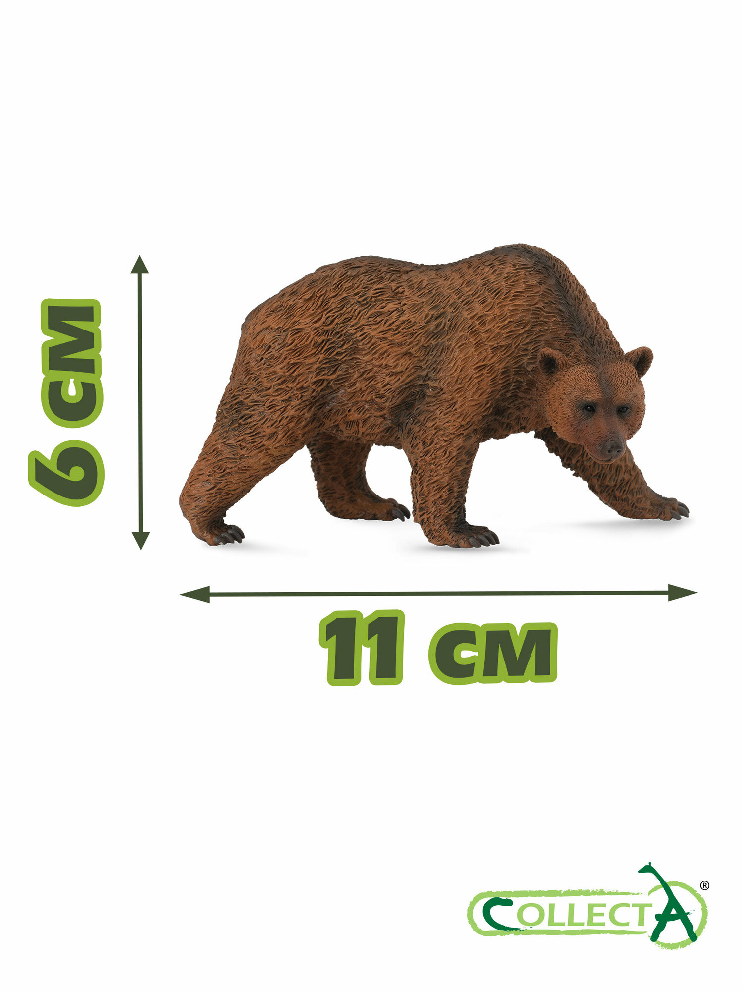 Фигурка Бурый медведь, представленная английским производителем Collecta, поразит ребенка реалистичностью и красотой. Игрушечный медведь повторяет формы и пропорции настоящего животного, обитающего в таежных лесах евразийского континента. У фигурки хорошо различимы умная морда с длинным носом и близко посаженными глазами, мощный торс с характерно выступающей холкой, сильные лапы с длинными когтями. Игрушка изготовлена из каучукового пластика и раскрашена вручную.