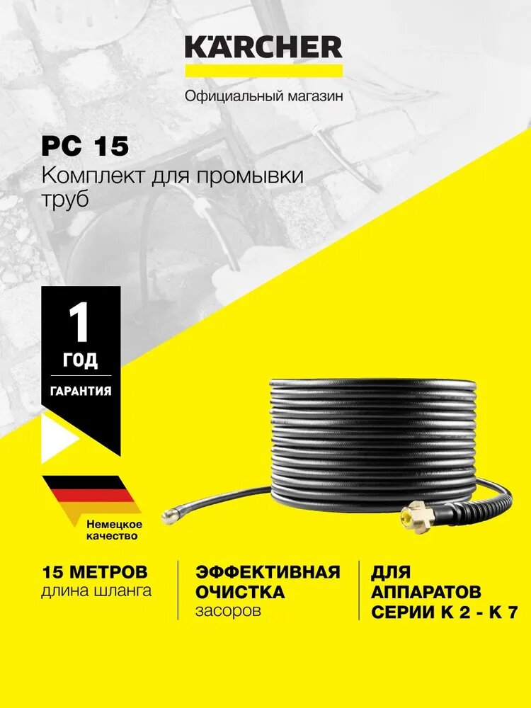 Комплект для промывки труб позволяет прочищать засорившиеся трубы и стоки. Четыре направленные назад струи высокого давления обеспечивают продвижение шланга по трубе и удаление грязи. Высококачественный гибкий шланг снабжен отметками и маркерным кольцом, позволяющим отслеживать продвижение по трубе. Шланг 15 м армирован текстильной оплеткой, защищен от перегиба, снабжен очень коротким латунным соплом для максимальной подвижности и долговечным латунным разъемом. Комплект для бытовых аппаратов высокого давления Kärcher может применяться в доме и на открытом воздухе.