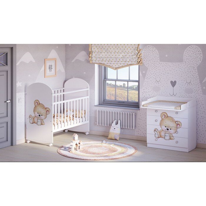Комод имеет четыре вместительных ящика с эргономичными ручками. Съемная пеленальная доска. Яркий рисунок на фасадах.