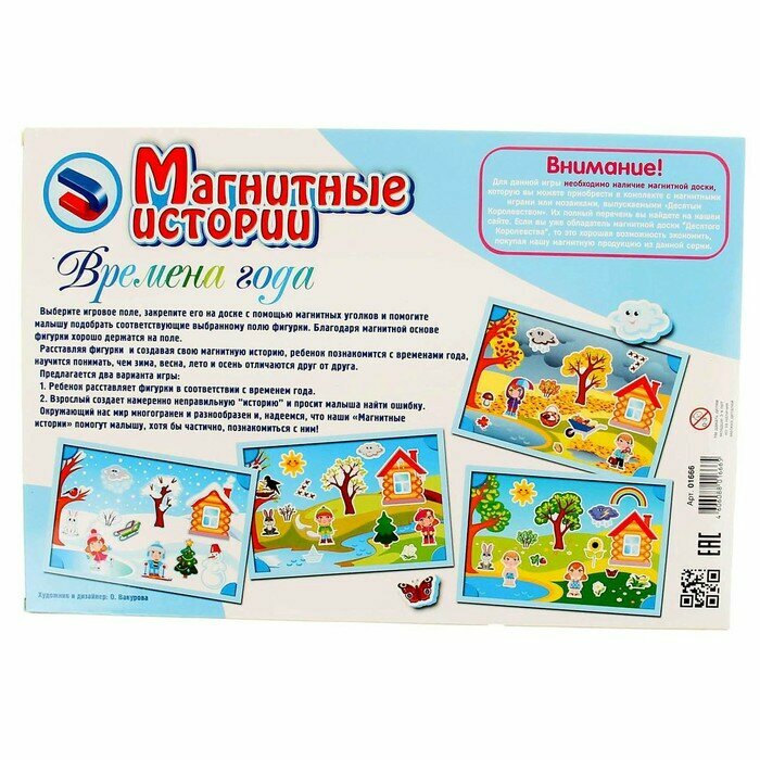 Обучающая развивающая игра, предназначенная для детей старше 3 лет. Дополнительный набор отличается от основного, артикул 01542, отсутствием магнитной доски. Если у вас уже имеется любая игра из серий Магнитные истории или Пифагорики, планшет от нее подойдет к этому дополнительному набору и даст возможность сэкономить на покупке. Если же вы покупаете наши обучающие наборы впервые, предпочтительнее приобрести полноценную игру арт.01542 с магнитной доской. Времена года - познавательная для Вашего ребенка игра, позволяющая познакомиться с временами года, научиться понимать, чем зима, весна, лето и осень отличаются друг от друга. Выберите игровое поле, закрепите его на доске с помощью магнитных уголков и помогите ребенку подобрать, соответствующие выбранному полю фигурки. Магнитная основа поля позволяет фигуркам хорошо держаться на нем. Предлагается два варианта игры: 1. Ребенок расставляет фигурки в соответствии с временем года. 2. Взрослый создает намеренно неправильную историю и просит малыша найти ошибку. Надеемся, что наши игры помогут вашему ребенку в познании окружающего нас многогранного и разнообразного мира.