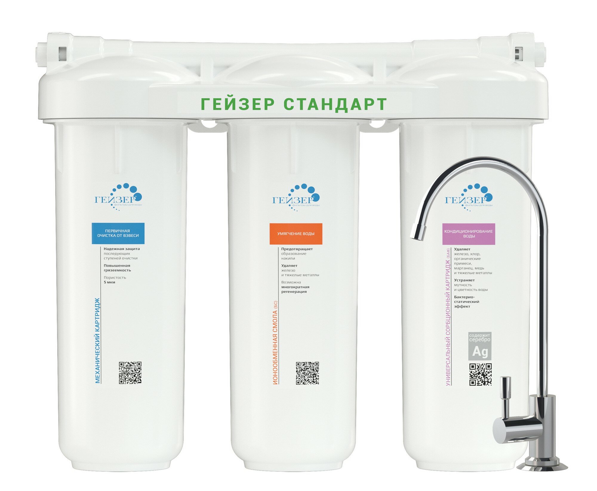Фильтр Гейзер Стандарт специально разработан для регионов с жесткой водой (средний уровень минерализации). Фильтр Гейзер состоит из 3 картриджей: 1. осадочный картридж РР удаляет нерастворимые частицы, размером до 5 мкм (ржавчина, взвеси) 2. БС для удаления солей жесткости 3. БАФ универсальный картридж для удаления хлора, органических примесей, железа и тяжелых металлов. Содержит серебро. Замена картриджей для семьи из 3-4 человек в среднем 1 раз в год.