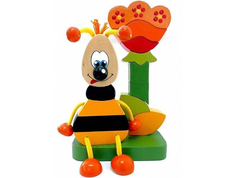 Пирамидка в виде забавного шмеля от Крона состоит из 14 деталей. Она изготовлена из натурального массива дерева и станет полезной, обучающей игрушкой для вашего малыша. Игрушка состоит из яркого цветка и насекомого с лапками-шнурками. Она поспособствует развитию мелкой моторики, цветового восприятия и логического мышления.