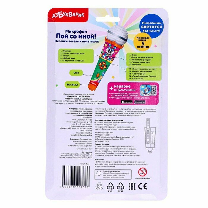 Каждый ребёнок может стать звездой! Весёлое пение с этим чудо-микрофоном раскроет музыкальные и актёрские таланты малыша! Главный сюрприз – микрофон светится под музыку, как настоящий диско-шар. Слушай и пой 15 хитов из любимых мультфильмов («Не ходите, дети, в Африку гулять», «Хвост за хвост», «Человек собаке друг», «Песня Гениального Сыщика» и др.). Мобильное приложение от Азбукварика подарит ещё больше веселья! Скачай книжку «Караоке» с помощью бонусного QR-кода на упаковке.