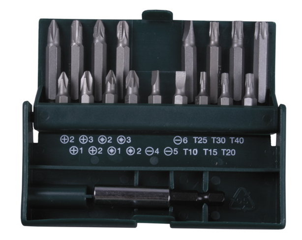 | Комплектация набора | 9 бит 25 ммSL4, 5, PH1, 2, PZ1, 2, TORX10, 15, 20,8 бит 50 ммSL6, PH2, 3, PZ2, 3, TORX25, 30, 40,удлинитель-адаптер с магнитным держателем для бит. |