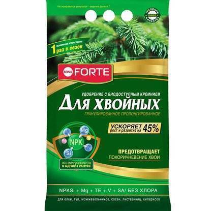 Удобрение BONA FORTE предназначено для подкормки можжевельника, ели, туи, сосны, лиственницы, кедра и других хвойных растений.