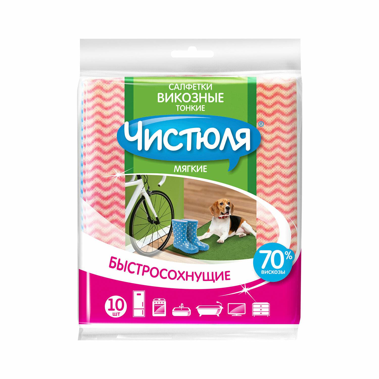 Салфетки предназначены для влажно и сухой уборки, превосходно впитывают влагу и не оставляют волокон. Салфетки позволяют быстро и качественно очистить кухонные столы, кафель, раковины, сантехнику, деревянную мебель и прочее.