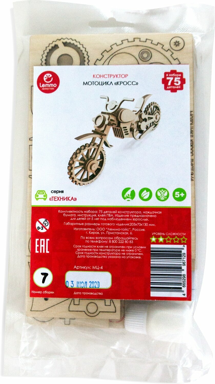 Сборная деревянная модель Lemmo Мотоцикл кросс Мотоцикл Кросс (75 деталей)