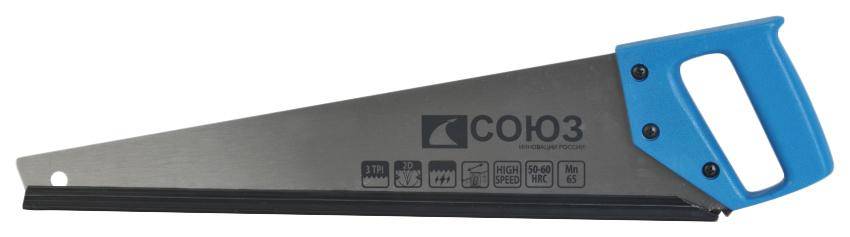 Ножовка по дереву Союз 1060-13-450С имеет длину полотна 450 мм и оснащена трёхгранными зубьями (3TPI) с двумя режущими кромками (2D).Преимущества Крупный зуб обеспечивает рез на 30 % быстрее обычного Двухгранная алмазная заточка снижает трение и увеличивает скорость распила Зуб закалён до 60 HRC, благодаря чему долго сохраняет заточку Антикоррозийное полимерное покрытие защищает полотно от воздействия влаги Эргономичная рукоятка плотно лежит в руке, улучшая контроль инструмента Пластиковый защитный кожух предохраняет от случайных порезов