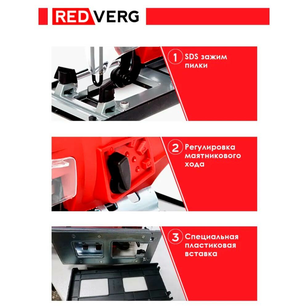 Полупрофессиональная модель RedVerg отличается компактностью и мощностью. Лобзик предназначен для повы шения производительности ручного труда при прямолинейном и фигурном пилении древесины, пластмассы, чёрных и цветных металлов, строительных мате риалов. Подходит для бытового использования, для мастерских и небольших производств при не частой эксплуатации.