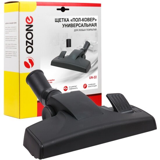 OZONE Универсальная высокоэфективная щетка "Пол-Ковер" Максимальная эфективность всасывания, удобный ножной переключатель режима работы пол-ковер, дополнительные ролики в рабочей зоне подошвы предотвращают появление царапин на паркете и ламинированных полах. Подходит для всех типов пылесосов с диаметром удлинительных трубок 32 или 35 мм., переходник в комплекте.