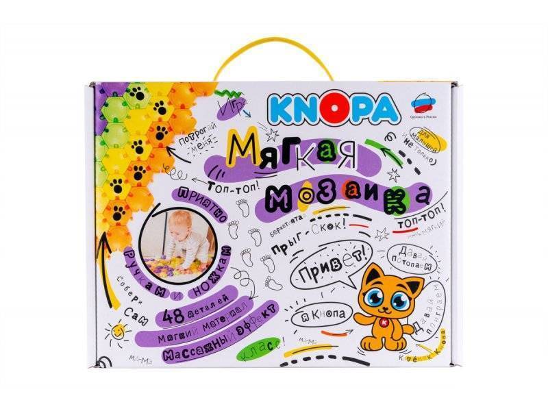 Фирменная упаковка конструктора-коврика выделит его на полке среди прочих развивающих игрушек и прекрасно подойдет для практичного, интересного и яркого подарка малышу.