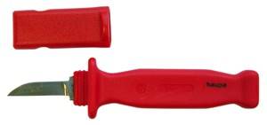 Нож диэлектрический для снятия изоляции с гибким лезвием. Нож электрика снабжён защитой от поражения электрическим током напряжением до до 1000 V. Эргономичная двухкомпонентная рукоятка кабельного ножа выполнена из вязкоупругого, ударопрочного пластика с защитой от соскальзывания. Защитный чехол для лезвия в комплекте. Применение: прорезиненная изоляция