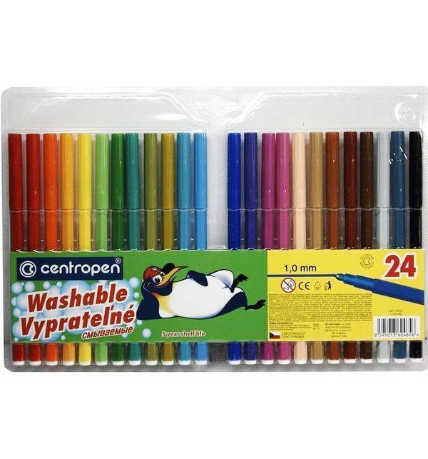 Красочные фломастеры Centropen прекрасно подойдут как для школьных занятий, так и просто для рисования или раскрашивания. Корпус фломастера изготовлен из полипропилена, снабжен вентилируемым колпачком. Износоустойчивый пишущий узел обеспечивает линию шириной 1мм. Фломастеры заправлены стойкими чернилами ярких цветов, которые легко смываются даже холодной водой. Набор из 24 цветов предоставляет простор для детского творчества. Поставляется в ПВХ блистере с европодвесом.