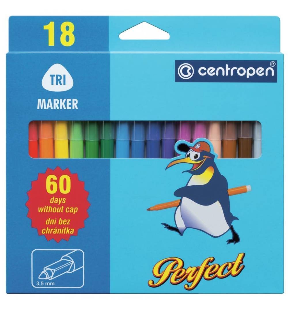 Почему дети так любят рисовать фломастерами? Юных художников прельщает не только бесконечная тяга к творчеству, но также практичность и эргономичность при использовании пишущих инструментов.В отличие от карандашей, фломастеры не нуждаются в заточке и не требуют усилий для создания ярких линий. Перед красками у них преимущество в том, что изображения сразу получаются чёткими, а насыщенность цвета нисколько не уступает гуаши.Простота, в мгновение ока создающая красоту, — вот что по-настоящему привлекает маленьких творцов!Как выбрать подходящий фломастер? Необходимо учитывать сразу несколько аспектов: тип чернил (водная или спиртовая основа), вид наконечника (пластик или синтетические волокна, толстый или тонкий), тип корпуса (полистирол или полипропилен) и даже колпачок (крупный или мелкий). Фломастеры 18 цветов 3.9 мм Centropen 2510 Perfect, невысыхаемые, картонная упаковка, европодвес — это превосходный выбор для создания мини-шедевров с мини-затратами. Высококачественное изделие направит весь творческий потенциал ребёнка в нужное русло.