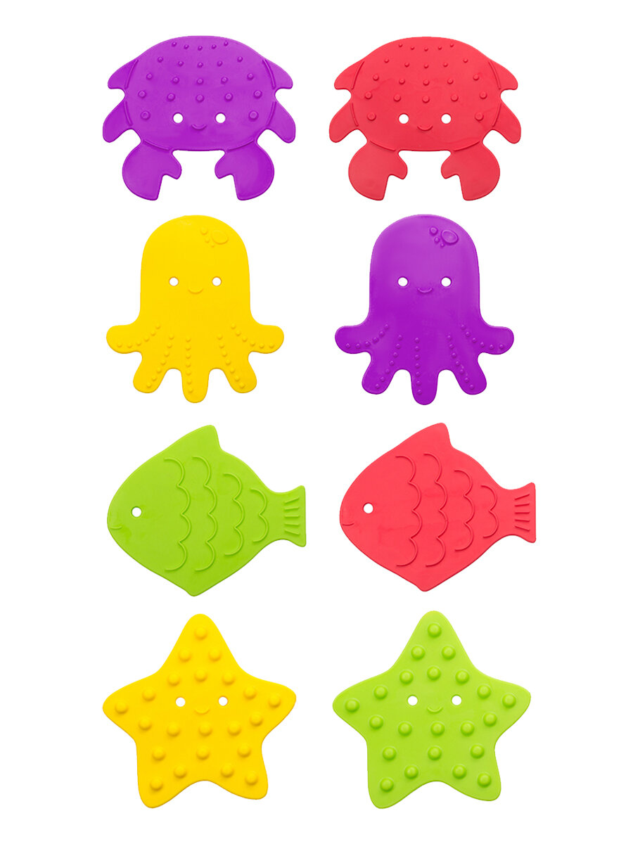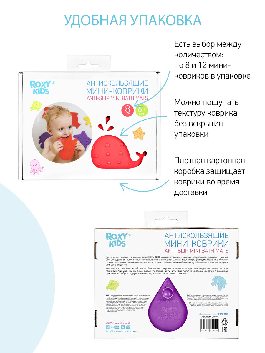 Антискользящие мини-коврики от ROXY-KIDS- первые многофункциональные мини-коврики, произведенные в России из абсолютно безопасных материалов. Особенность этих малышей в виде морских животных в том, что им действительно можно найти множество применений: антискользящая поверхность для купания: отличная замена большому коврику, который неудобно промывать и сушить, массажер: рельефная поверхность (маленькие точки, зигзаги, большие пупырышки) обеспечивает бережный массаж стоп и ладоней, грызунок: мини-коврики произведены из термоэластопласта – материала современных прорезывателей, поэтому вы без опаски можете позволить малышу тянуть их в рот, развивашка: мало того, что это тренажер для развития мелкой моторики и хватательных рефлексов, с мини-ковриками от ROXY-KIDS ваш малыш познакомится с названиями морских обитателей (в комлекте рыбка, осьминог, краб и морская звезда) и выучит основные цвета, украшение интерьера: налепите коврики на дно и стенки ванны, на кафель или даже на пол, чтобы не только обеспечить удобство, но и расставить яркие цветовые акценты! Кроме того, эти мини-коврики абсолютно не пахнут, ведь не содержат ПВХ. Они просты в уходе: достаточно просто периодически промывать их с мылом, полоскать и сушить. Они легко и надежно крепятся с помощью присосок на любую гладкую поверхность, при этом не оставляют следов.