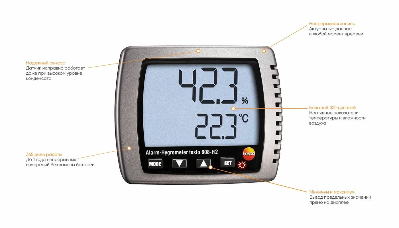 В ходе контроля заданных климатических условий необходимо не только отслеживать текущие показатели температуры и влажности, но и фиксировать нарушения установленных граничных значений. Для решения таких задач предназначен электронный гигрометр Testo , который, обладая всеми преимуществами модели Testo 608-H1, дополнительно оснащен сигнальной функцией (с LED индикацией).
