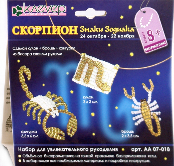 Набор "Скорпион" из серии "Знаки Зодиака" для плетения из бисера включает три стилизованных изображения льва в виде стильного кулона, оригинальной броши и объёмной фигурки.
