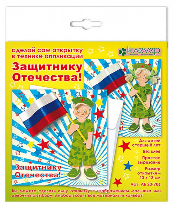 Набор, чтобы сделать самостоятельно открытку. Даже флаг и тот тремя полосками. Для сына 9 лет вполне посильная открытка.