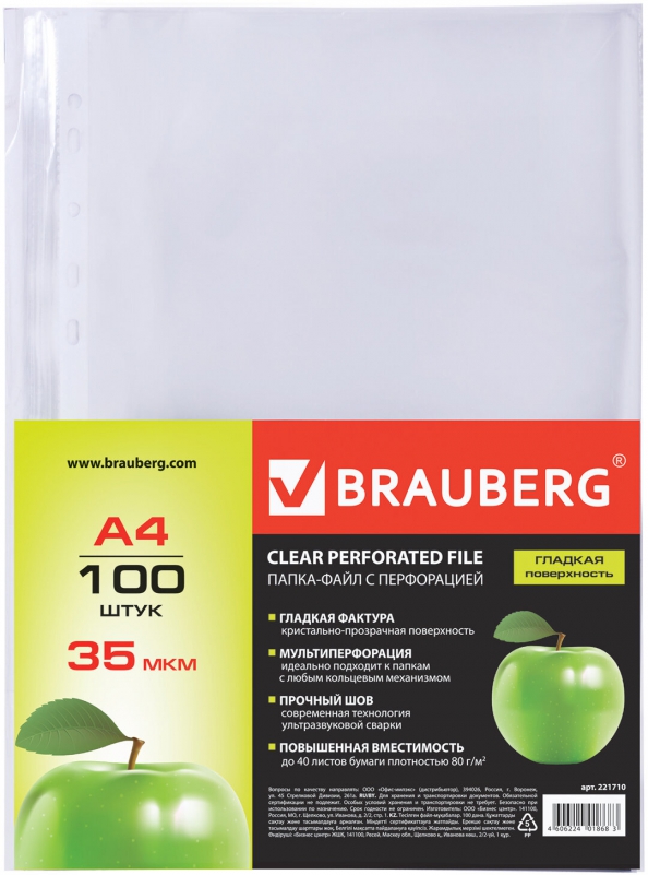 Папка-файл с перфорацией, А4, 100 штук (221710); Brauberg, 2011