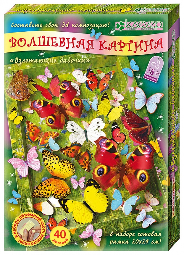 Картина "Взлетающие бабочки" серии "Волшебная картина" (для детей старше 8 лет) действительно волшебная: с неё будто взлетают, подрагивая крыльями, яркие бабочки. Сделать картину в технике простой бумагопластики легко - вырезать и выгнуть детали, склеить "волшебные" крепления и при помощи креплений наклеить детали на картину. Эффект перспективы достигается за счет глубокой готовой рамки и технической возможности "волшебных" креплений приближать и удалять детали. Клей не понадобится. Вместо клея - двусторонний скотч.