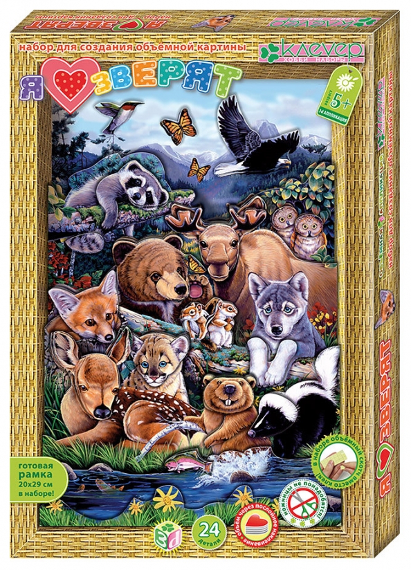 Красочную картину "Я люблю зверят" ребёнок старше 5 лет с помощью взрослых сможет сделать сам - без клея и ножниц, в технике 3-D аппликации. Персонажи картины - знакомые нам всем зверята - мишка, лосёнок, волчонок, лисёнок, оленёнок, маленький енотик, бельчата, совята и другие зверята. Работая с набором, ребёнок учится складывать трёхмерное изображение из частей, составляя перспективу. Рамку собирать не нужно - красочная и глубокая готовая рамка входит в набор. Клей также не нужен - вместо него в наборе объёмный двусторонний скотч.