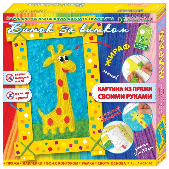 Комплектация: цветная гипоаллергенная пряжа, картонный фон с контуром, картонные рамки, тонкий и объемный двусторонний скотч, наклейки.