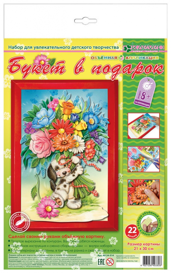 Набор для создания картины в технике объёмной аппликации "Букет в подарок" - это и оригинальная картина и увлекательное занятие для ребёнка старше 8 лет. Добрый щенок принес лучший в мире подарок - большой яркий букет цветов! Букет нарисован с использованием нежных акварельных переходов цвета и ярких акцентов на любимые всеми розы, нарциссы, колокольчики, ромашки. Картина станет живее и объёмнее, если вырезать детали и наклеить их по номерам слоями на объёмный двусторонний скотч. Яркая рамка входит в набор!