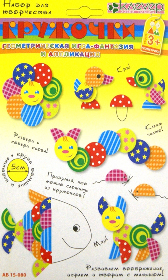 В наборе: двусторонний скотч, 8 кружочков, примеры аппликаций. Кружочки яркие, красочные, из плотного картона. Один кружочек с мордочкой, чтобы сделать кошку, гусеницу или цветочек, как на коробке. Кружочков хватает либо на одну большую фигурку, либо две маленьких. За такую цену 8 картонных кружочков, конечно, дороговато. Но этот набор хорош тем, что можно подчерпнуть идеи, вырезать кружочки из картона и наделать много-много аппликаций.