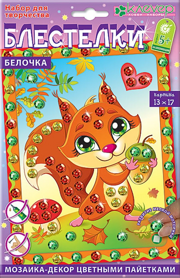 Белочка запасает на зиму орешки и грибы, найденные под разноцветными листочками в осеннем лесу. Мини-картины серии "Блестелки" - первые шаги ребёнка старше 5 лет в освоении интересной и красочной техники мозаики. Это самый простой пример мозаики - не сплошное составление картины из мелких элементов, а декорирование её отдельных частей. Украсьте картину разноцветными искрящимися пайетками! Без клея - аккуратно и чисто!