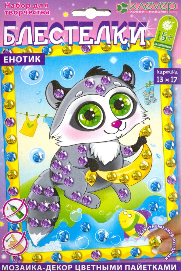 Енотик-чистюля старательно полощет бельё и вокруг разлетаются радужные мыльные пузырьки. Мини-картины серии "Блестелки" - первые шаги ребёнка старше 5 лет в освоении интересной и красочной техники мозаики. Это самый простой пример мозаики - не сплошное составление картины из мелких элементов, а декорирование её отдельных частей. Украсьте картину разноцветными искрящимися пайетками! Без клея - аккуратно и чисто