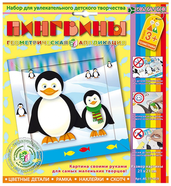 Набор для изготовления картины "Пингвины" является не только замечательным подарком, но и увлекательным методическим пособием, развивающим способности ребёнка младшего дошкольного возраста. Малыш знакомится с разными по фактуре материалами (цветной картон разной плотности, самоклейка, объёмный скотч) и с разными геометрическими фигурами (круг, полукруг, квадрат, прямоугольник). Он может разделять фигуры на части, сравнивать их величину и склеивать из частей целое. Наклеивая на картинку фигуры, ребёнок учится достраивать изображение, создавать целое путём комбинирования различных деталей. Интересный сюжет картинки помогает ребёнку описывать свою работу, рассказывать, какие фигуры он использует, из каких материалов и какого цвета эти фигуры, какое изображение у него получается. Он начинает понимать значение пространственных предлогов и наречий места. Поощряйте ребёнка, когда он использует эти части речи, и не забывайте о развитии у него математических представлений, задавая вопросы "сколько", "какой по счёту" и т.д.