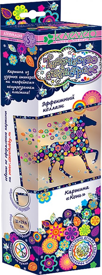 Картина-коллаж из стильных стикеров на затемнённом полупрозрачном фоне "Конь" понравится ребёнку старше 8 лет: он легко наклеит на пластик части рамки и грациозный силуэт скакуна, а затем украсит изображение узорными и блестящими стикерами, будто бы слетающими с силуэта. Особенно эффектно картина смотрится на фоне узора обоев, который слегка просвечивает сквозь полупрозрачный пластик кофейного оттенка. А в рамке из багета картина-коллаж превратится в настоящий шедевр и станет ярким акцентом в любом интерьере!