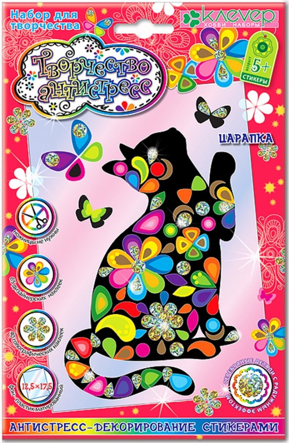 Картины-антистресс - это лучший способ отдохнуть и зарядиться энергией творчества! Ребёнок старше 5 лет легко наклеит на матированный полупрозрачный пластик изящные чёрные силуэты кота Царапки и порхающих вокруг бабочек, заполнит их узорными радужными стикерами, а потом украсит картину блестящими голографическими элементами разнообразных форм.