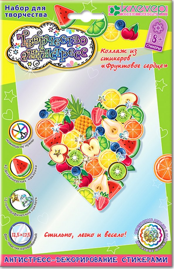 Набор "Фруктовое сердце" поможет сделать коллаж из узорных стикеров-фруктиков и блестящих стикеров: ребёнок старше 8 лет наклеит их на матированный полупрозрачный пластик и создаст оригинальную картинку. Или можно украсить фруктовым сердцем тетрадь, пенал, ноутбук или планшет, зеркало, окно, холодильник или дверь детской комнаты.