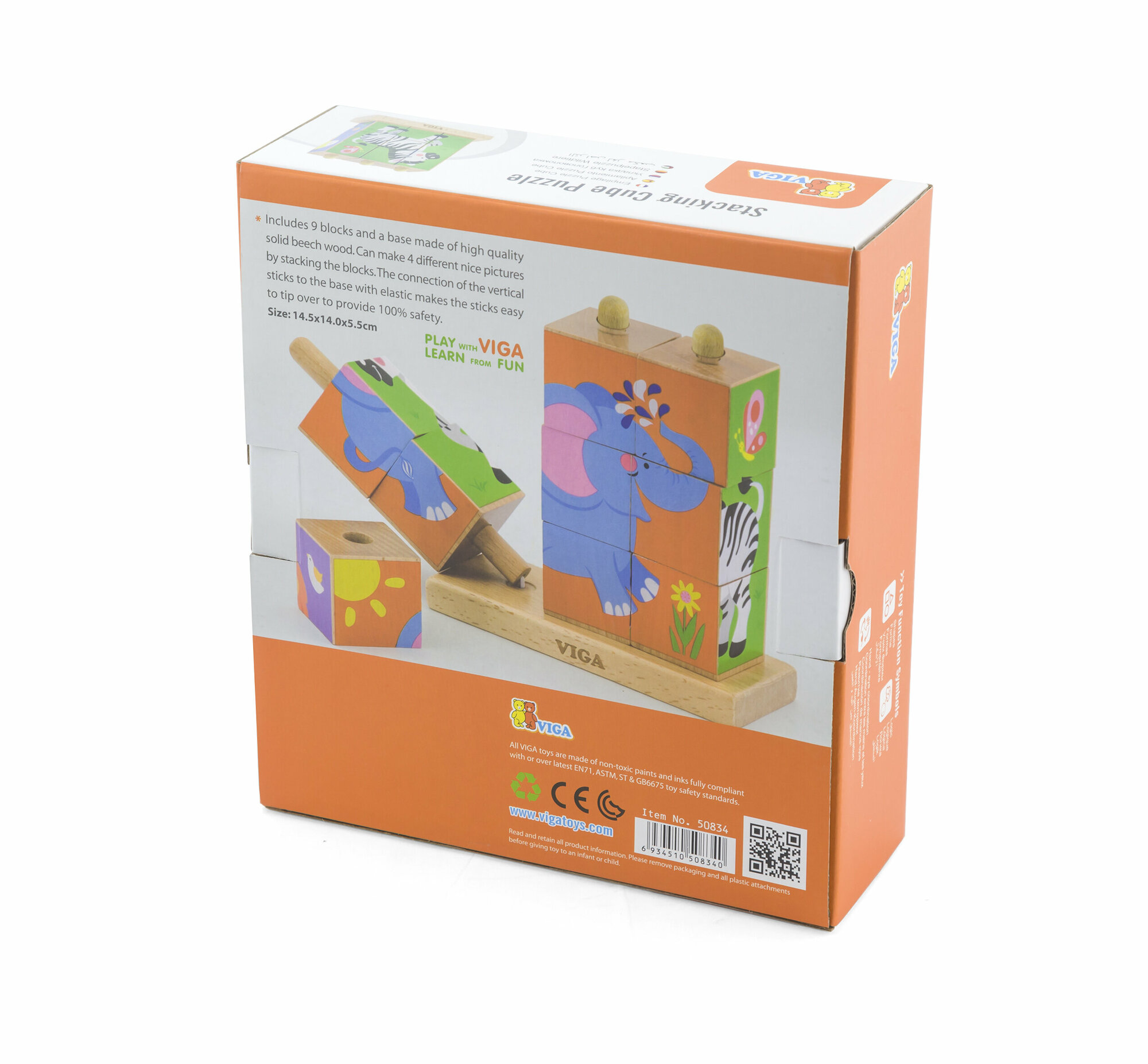Деревянные кубики-пирамидка Дикие животные от Viga Toys – это необычная развивающая игрушка для малышей от 2-х лет, выполненная в виде вертикального пазла.Деревянная игрушка состоит из 9 кубиков и стойкой деревянной подставки с тремя стержнями. Благодаря уникальной конструкции, из кубиков можно собрать 4 изображения.Собирая картинку, ребенок учится фокусировать внимание, тренирует зрительно-моторную координацию, движение рук. Соотнося части и целое, малыш развивает память и логическое мышление. Кубики-пирамидка Viga Toys подходят для занятий дома и в группе, в частности по системе Монтессори. Рекомендованы для детских садов и центров развития.Деревянные кубики-пирамидка от Viga Toys выполнены из экологичного материала. Все стержни с закругленными концами соединены с основой резинками для безопасной и комфортной игры. Размер кубиков: 4,5 см. Параметры собранной пирамидки: 14,5х14х5,5 см.Она выполнена из качественной древесины бука с использованием нетоксичных красок.