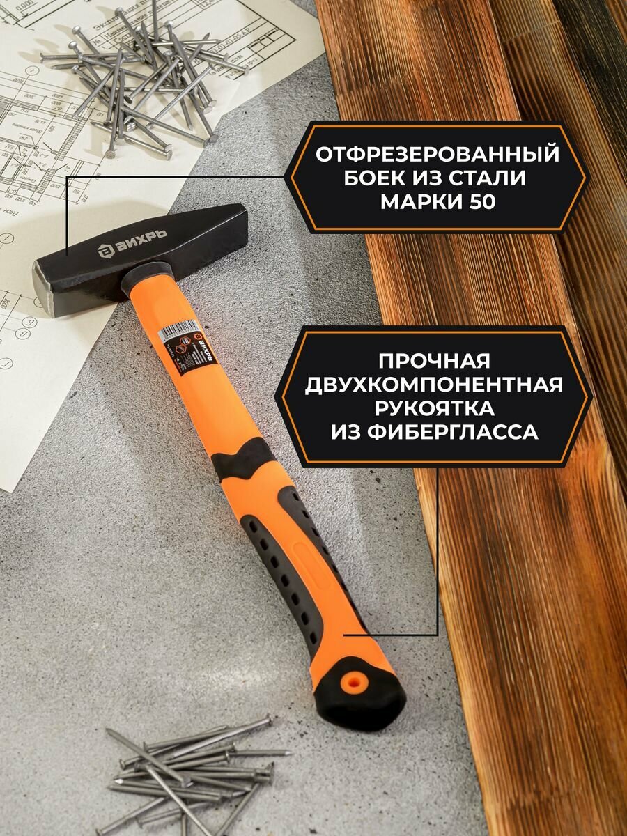 **Молоток ВИХРЬ 400гр, с фибергласовой рукояткой** - Боек покрыт черным лаком и надежно зафиксирован на рукоятке при помощи эпоксидного клея. Боёк кованый и отфрезерованный, изготовлен из стали марки 50. Рабочие части бойка закалены, соответствуют требованиям ГОСТ 2310-77. Рукоятка изготовлена из фибергласса (стеклопластика), обладающего высокой механической прочностью, и устойчива к воздействию масел, бензина и растворителей. Стальной боёк квадратной формы, весит 0,4 кг.